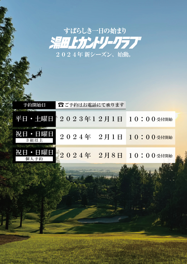 【2024年度】予約受付開始日のご案内 2023.11.18 ご覧いただき、ありがとうございます。 12月1日(金)午前10時より、2024年度平日・土曜日の予約受付が開始となります。 ご予約はお電話にて承ります。 お日にちによっては混み合う可能性もございますので、 ご予定がお決まりの方はお早めにご予約いただければ幸いです。 日曜日・祝日の予約開始日につきましては、下記の日程表をご覧ください。 皆様のご予約を心よりお待ちしております。